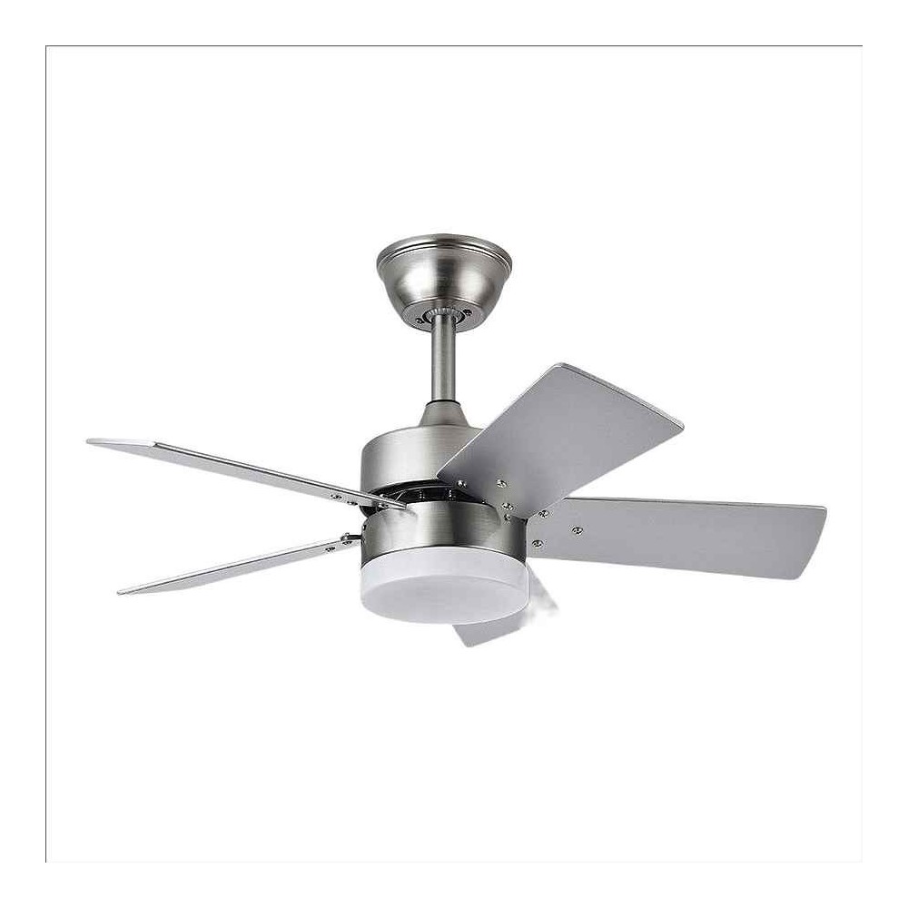 Nickel-colored DC Ventilator with five REVERSIBLE handles in silver/HAYA and six speeds. Its dimensions are 41x76x76 inches. It has LED technology integrated with a power of 36 W, 3240 lumens and adjustable light in 3 positions (3000k warm white color, 4000k neutral white color, and 6000k cold white color), plus color memory. It has remote control Included with the summer/winter option and the timer option of 1 to 4 hours. The body of the fan is made of metal and polycarbonate; and the blades of MDF.