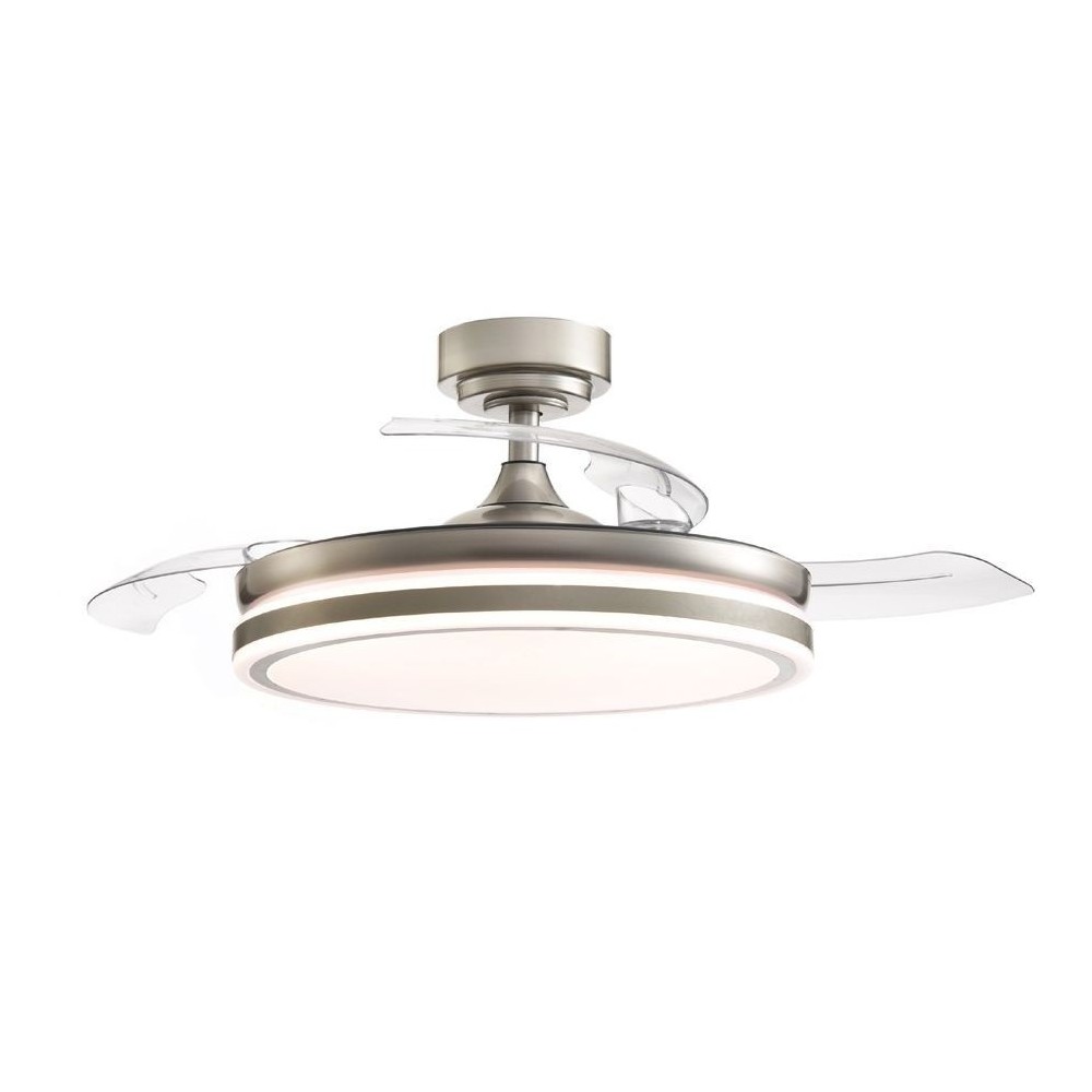 PRIME S built-in led ceiling fan in nickel finish with three highly resistant methacrylate blades in transparent finish. It is equipped with DC motor and six speeds.