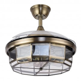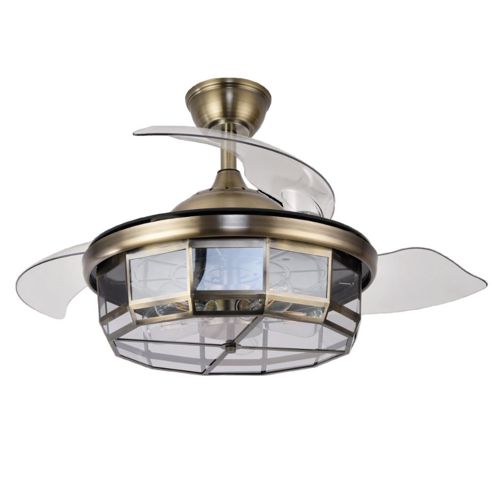 TORNADO series DC ventilator made of metal and acrylic crystal effect, in gold color with three transparent ABS ABS blades very resistant. It has 5 E27 lamps, bulbs not included. DC engine, it has six adjustable speeds.