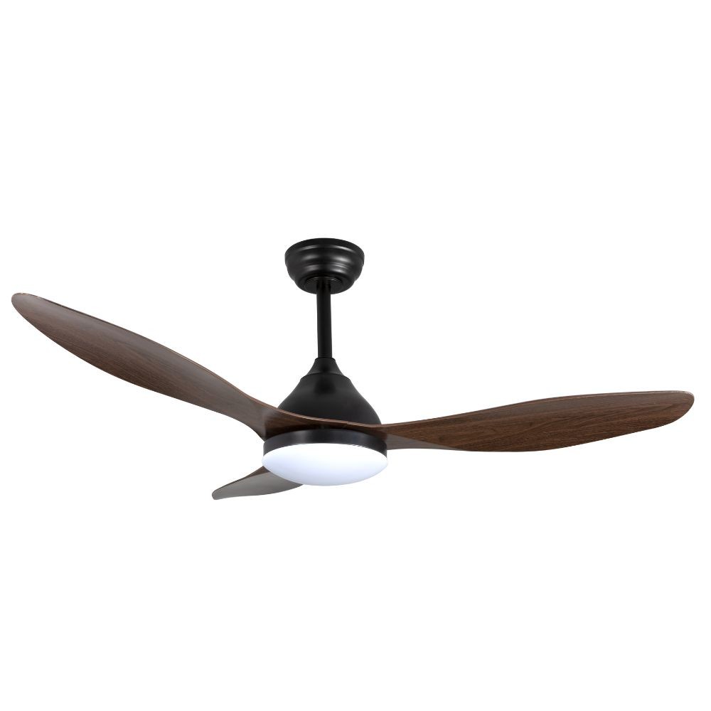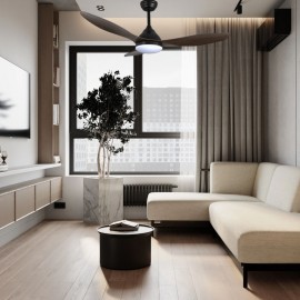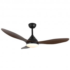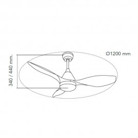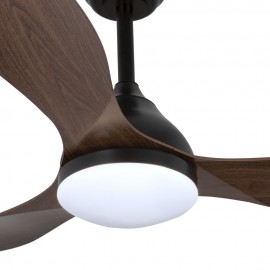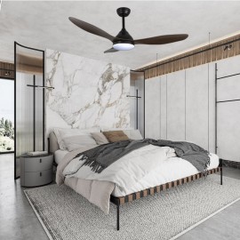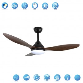 KARMA series ceiling fan made of metal, ABS asps and acrylic diffuser, black-wood, with three blades. Ultrasilious DC engine, six speeds. Built-in LED technology with a power of 20W, 1900 lumens and 3 SELECTABLE LIGHT TEMPERATURES (3000-4500-6000K) warm, natural and cold white light. Very modern and original design, ideal to place in bedrooms, living rooms and studios inspired by new styles of decoration such as Industrial or Modern. It has a dimensions of 34/44 X 120 cm. Air control summer or winter. Remote control Included with incorporated COLOR MEMORY and TEMPORIZER 2/4 H.