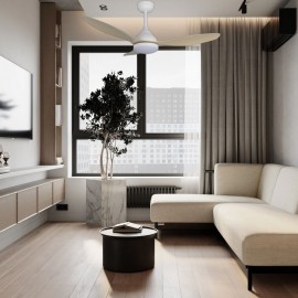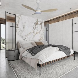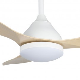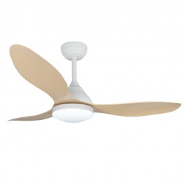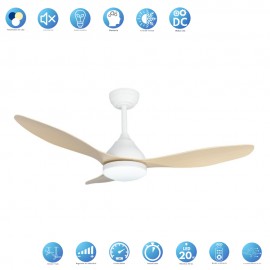 KARMA series ceiling fan made of metal, ABS asps and acrylic diffuser, white-haya, with three blades. Ultrasilious DC engine, six speeds. Built-in LED technology with a power of 20W, 1900 lumens and 3 SELECTABLE LIGHT TEMPERATURES (3000-4500-6000K) warm, natural and cold white light. Very modern and original design, ideal to place in bedrooms, living rooms and studios inspired by new styles of decoration such as Industrial or Modern. It has a dimensions of 34/44 X 120 cm. Air control summer or winter. Remote control Included with incorporated COLOR MEMORY and TEMPORIZER 2/4 H.