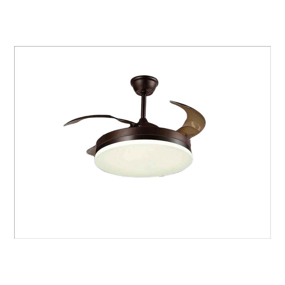 Ceiling fan with built-in led model matte brown color with bronze ring, opal diffuser and 4 smoke drop-down handles in high resistance acrylic. It is equipped with DC motor and six speeds. Of measures 50 centimeters with folded asps and 100 centimeters with striped asps; and adjustable height 37-45 cm.