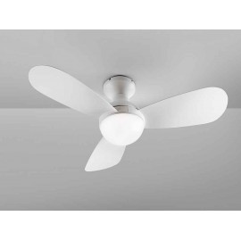 Ceiling fan with CCT LED light made of matt white finish metal and 3 gloss white acrylic blades. Opal acrylic diffuser. 6-speed DC engine and investment. 3 color temperatures. Timer.