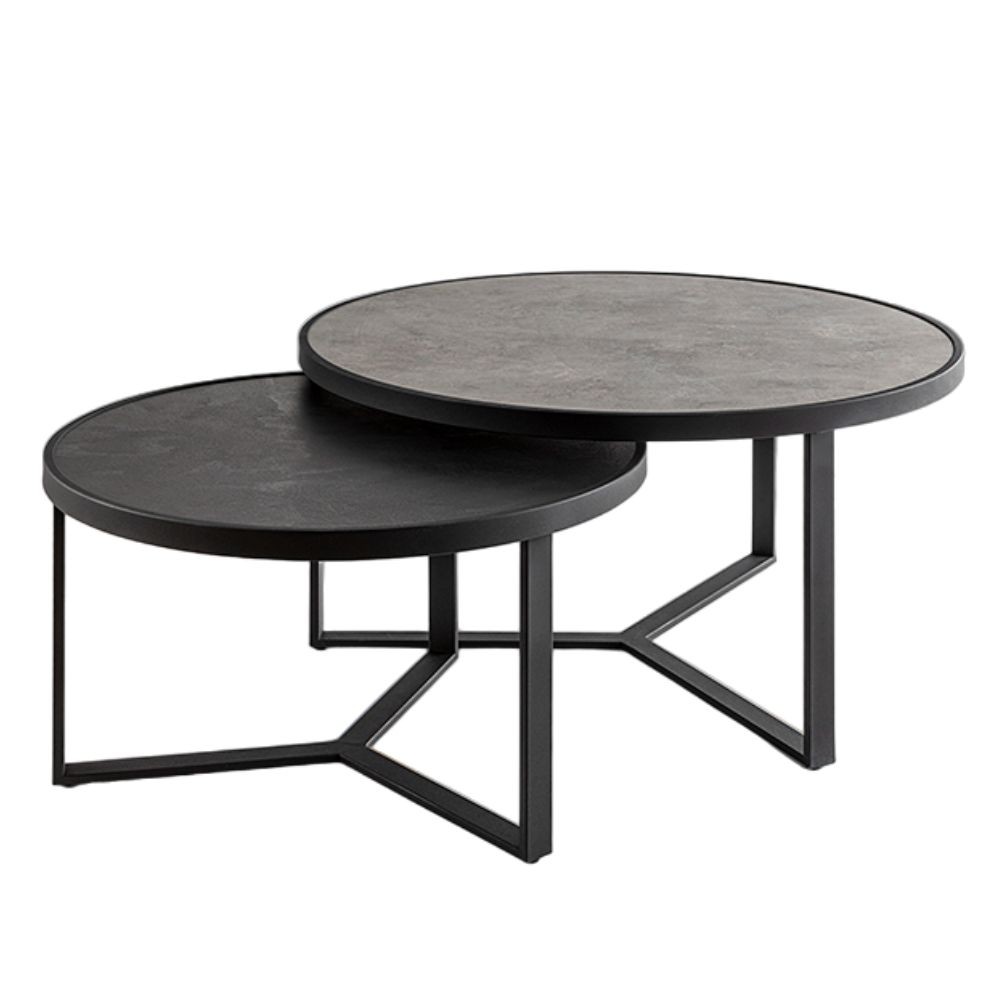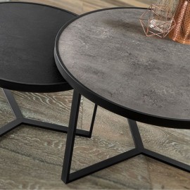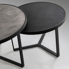 Couple of small auxiliary tables, made in metal, matt black finish. DM top with high resistance melamine surface, grey and black stone finish.