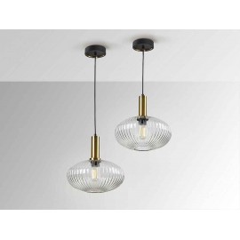 1 light Pendant model NORMA made of matt black finish metal, with satin brass details. Transparent molded glass tulip. Replaceable in height.
