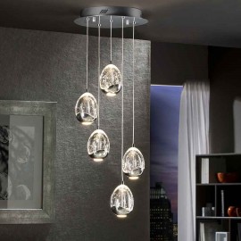 5 LED lamps LED model ROCIO DIMABLE. Made in chrome finish metal, with drop shaped tulips made in solid glass, with decorative bubbles inside. Illuminaicon 25W LED. 3.250 lm. 3,000 K. DIMABLE.