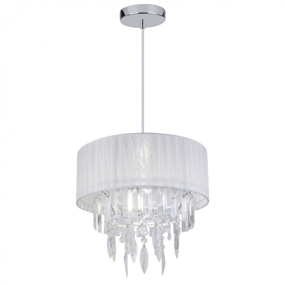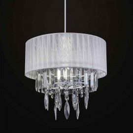 CLASSIC-style lamp with CAPEL-type crystals made of chrome-plated metal, with white fabric display and glass decorative clamps. Lighting for E27 bulbs, suitable for LED (but not included).