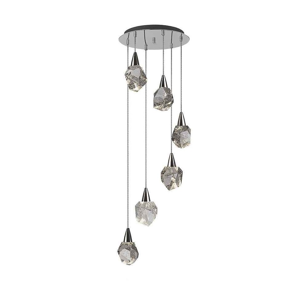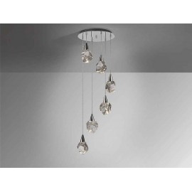 Circular lamp model AQUARIA of 6 LED lights, made in chrome finished metal, with polyester tulips made in solid glass with decorative bubbles inside. Replaceable in height. 24W LED. 2700 lm. 3,000 K.