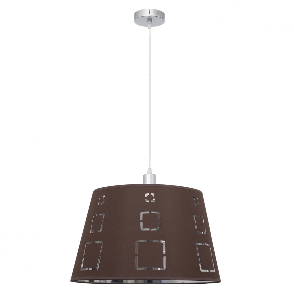 Lamp Celaya Series Pendant Brown. Made of chrome metal and textile material. The screen presents a design with geometric shapes that let the light pass. Its dimensions are 40 to 110x40x40 cm with adjustable height.