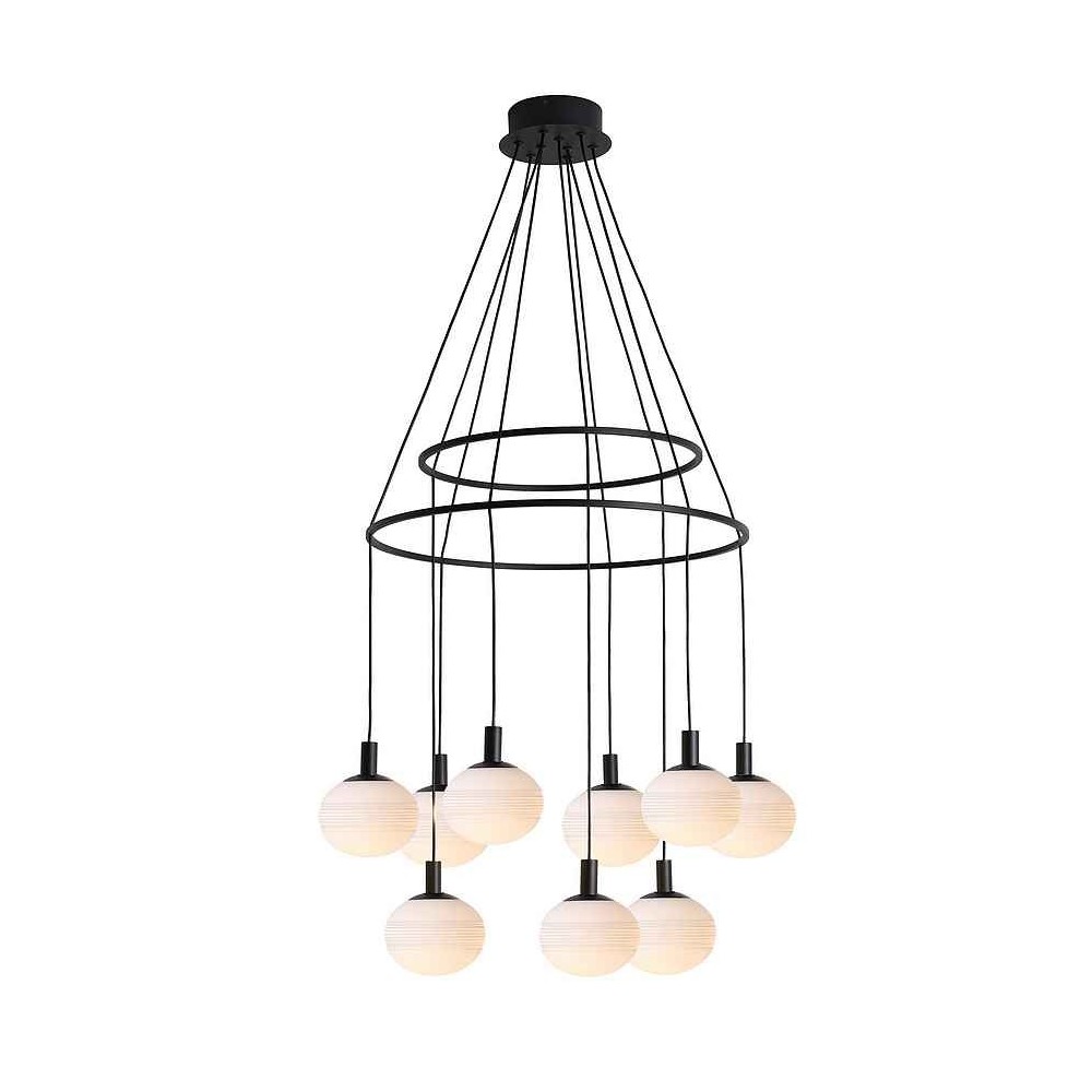 9 GLOBAL model lamp made of metal, matt black finish. Opal glass spheroidal tulips, adjustable height. DIMABLE