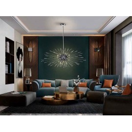 Lamp led dimable 9 lights, model EVASION spheroidal shape made in finished metal Chrome with transparent glass radial rods with the tips decorated in glossy chrome finish.