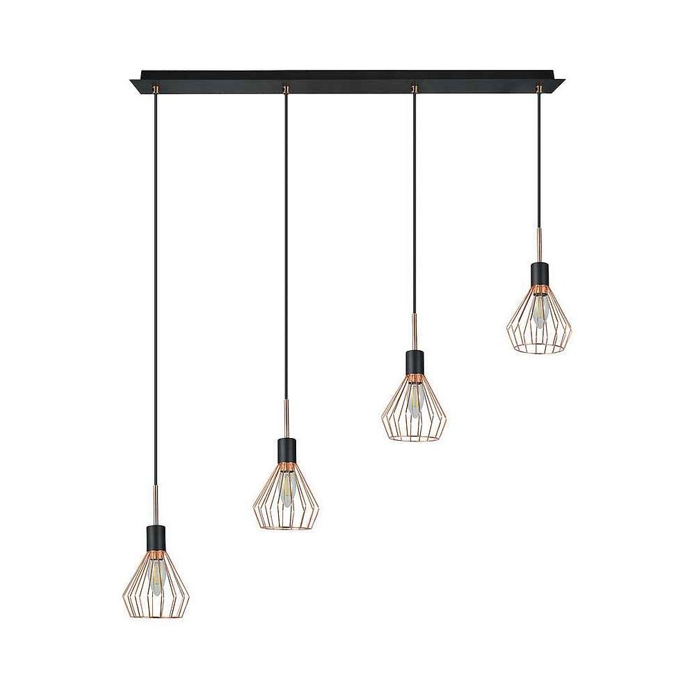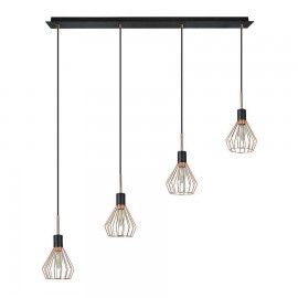 Linear lamp of four lights of the SAN PETERSBURGO series of color NEGRO/COBRE. Made in metal with modern and elegant design, it stands out for its metal tulips suspended at different heights, with four lamps in E14 . Not included bulbs. Original design ideal for living rooms and living rooms and even for modern-style decorated working areas, it is recommended to complete with filament bulbs fitting also very well in environments decorated with new Industrial and Vintage styles. Its dimensions, adjustable in height, are 50
