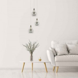 Three-light Pendant LHASA series in leather color. Made of metal, with double tulips of glass and metal suspended at different heights resulting in a beautiful design. Ideal for modern decorations of living rooms, living rooms and even working areas. It has three G9 lamps. Not included bulbs. Its dimension is adjustable in height of 30