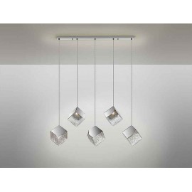 5-light linear lamp, PRISCILA model, made of metal and steel, chrome finish. with 5 Tulips of texturized glass. Its height is Reulable with 35 cm - 15 cm as maximum. This lamp weighs 7 kg.