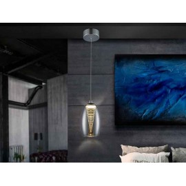 Pendant lamp model NEBULA 1 LED light, made in metal chrome finish. It has a double tulip, exterior made of mirrored glass and its interior in transparent polycarbonate with the shape of a staggered cone.
