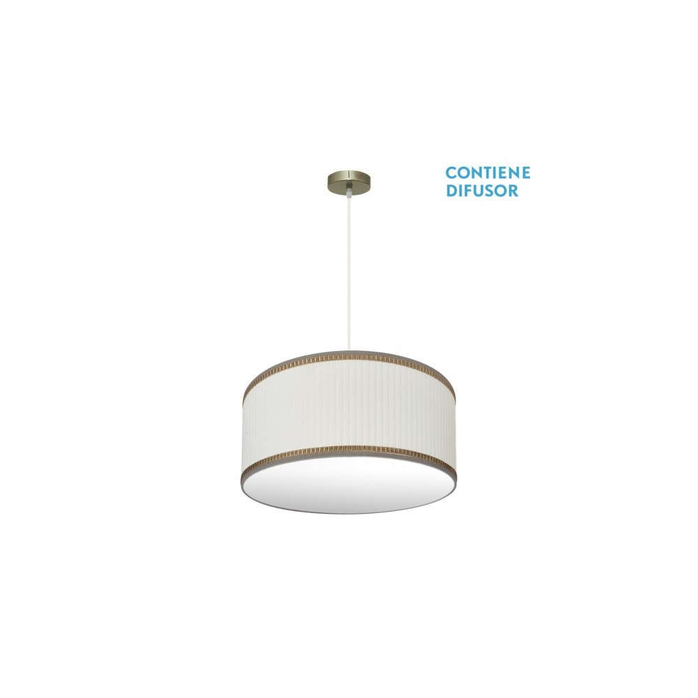 SOPRANO series Pendant in color CUERO with BEIS screen. Made of metal and textile material. Highlights its pleated screen ribbed in toasted color. Classic design but compatible with the new Vintage style, ideal to illuminate in bedrooms, living rooms, offices and living rooms. It has two portals E27. Not included bulb. Its height adjustable dimension is 40