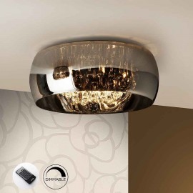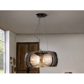 ...Cancun model ceiling lamp made of metal and crital, with white textile fabric...