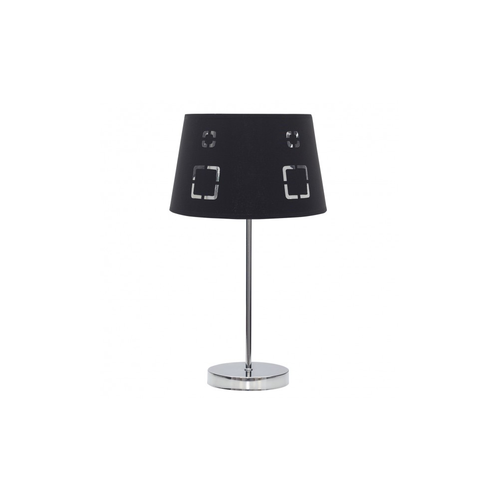 Lamp Overmese Celaya series black. Made of chrome metal and textile material. The screen presents a design with geometric shapes that let the light pass. Its dimensions are 43x25x25 cm. The pendant and lounge foot is available in black and various colors. The portal is E14.