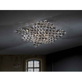 Dimensions: 43,0 12,0 43,0 cm Weight: 3.2 Kg Energy class: A+ Electric class: Class 1 Max power: 4x42W Voltage: 110/220 V Frequency: 50/60 Hz Luminous flux: 2.200 lm -Ceiling Lamp, or wall lamp made of chromed metal and K9 faceted crystals mesh. Clear and smoke crystals combined.-