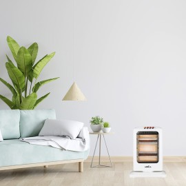 Electrical stove of the CANDENTE series in color BLANCO. Made of metal, polycarbonate and crystal. Equipped with 1200 maximum power watts distributed in its three glass tubes, to adjust between three heating powers, 400 watts, 800 watts and 1200 watts, depending on the size and temperature of the room to heat. Technology that creates heat instantly, with its oscillating function, you can redirect the heat angle to the room area that you want to heat with greater intensity. It comes with Anti-Volume system and a protective grid. Ideal for living rooms, bedrooms, studios and work areas, it is presented with a design of easy handling and easy to transport, thanks to its size and handle contained in its compact structure. It has some dimensions of 44x33x23 inches.