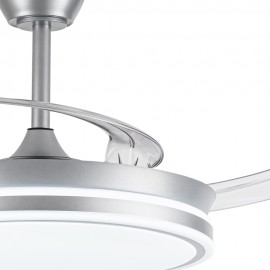 Este modelo de ventilador tiene un diseño moderno y gracias a su formato, con aspas desplegables, lo podemos utilizar como lampara durante todo el año, ademas de poder elegir el tipo de luz que mas nos interese en cada momento, ya sea calida-neutra-fria.
