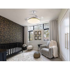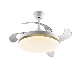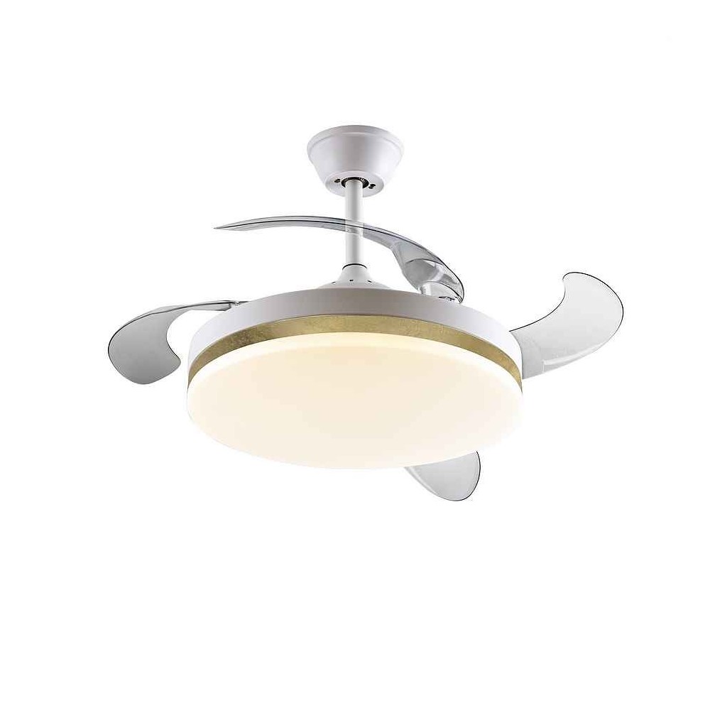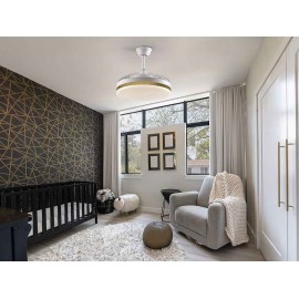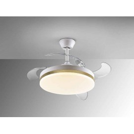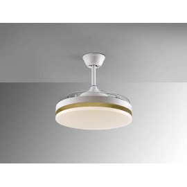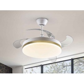 Ventilador de techo modelo VENTO con luz LED CCT DIMMABLE en metal acabado blanco mate y aro en PAN DE ORO. Difusor opal y aspas escamoteables transparentes, en acrílico. Motor DC de 6 velocidades e inversión. Tono de luz regulable. Temporizador.