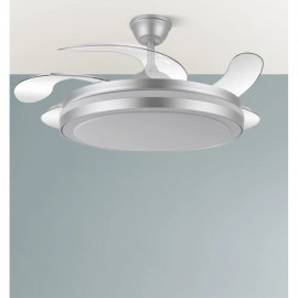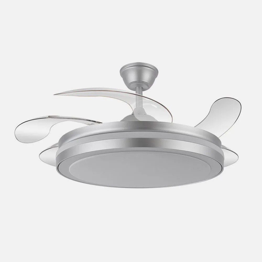 Ventilador DC de la serie ESPARTA MAXI realizado en metal, policarbonato y ABS, en color PLATA con cinco aspas DESPLEGABLES de ABS transparente muy resistentes.
