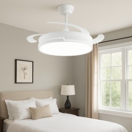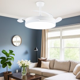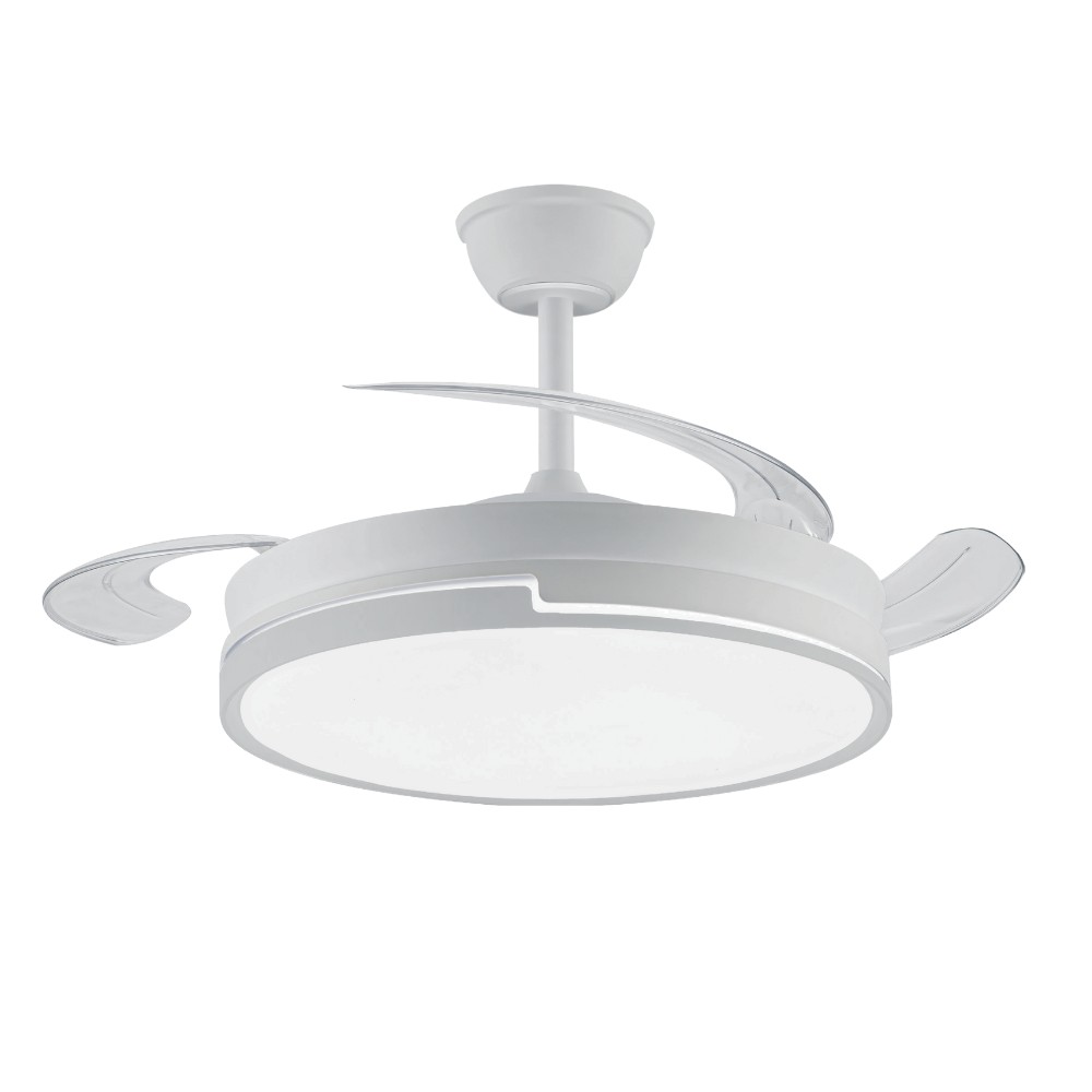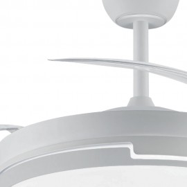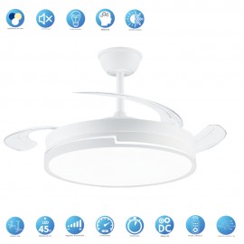 Ventilador DC de techo plumax realizado en metal, policarbonato y ABS, en color BLANCO con cuatro aspas DESPLEGABLES de ABS transparente muy resistentes.