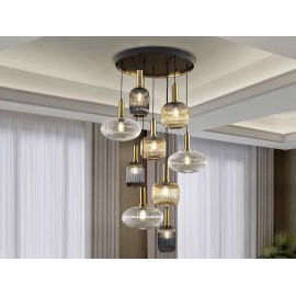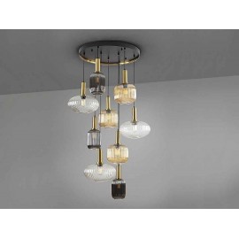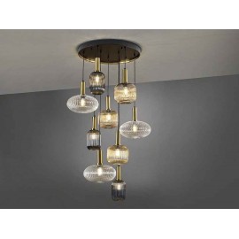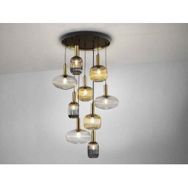 Lampe circulaire de 9 lumière en métal noir mat, avec détails en laiton satin. Tulipes en verre moulées dans des finitions transparentes, ambar et fumée grise miroir. Remplaçable en hauteur.
