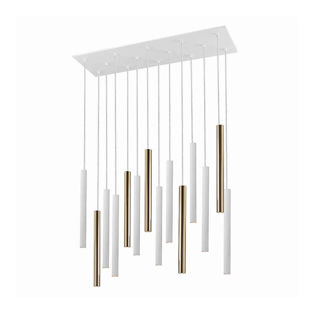 Lampe linéaire de 14 lumières LED DIMABLE modèle VARAS, en métal fini brillant or et blanc mat, avec diffuseur acrylique opal.
