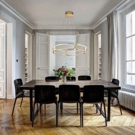 Avec la possibilité de réguler la hauteur dans son installation de 50 à 115 cm. et poids de 62 kg. La lampe Colette est disponible en chrome et en or avec un design moderne avec une inspiration en forme de anneau.