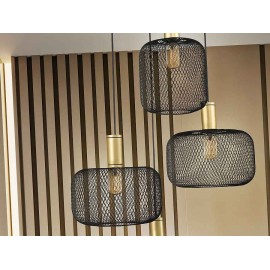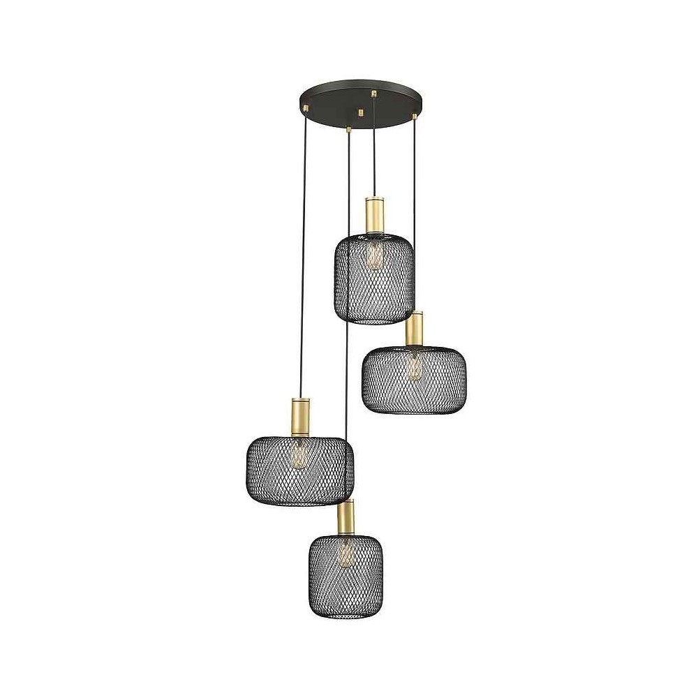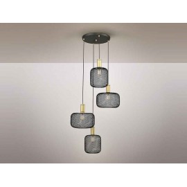Lampe ronde de 4 feux suspendus OSIRIS en métal avec 4 pendentifs, Comprend 2 dessins de tulipes en mailles métalliques. Finition en or et peinture noire mate. Câble textile noir.