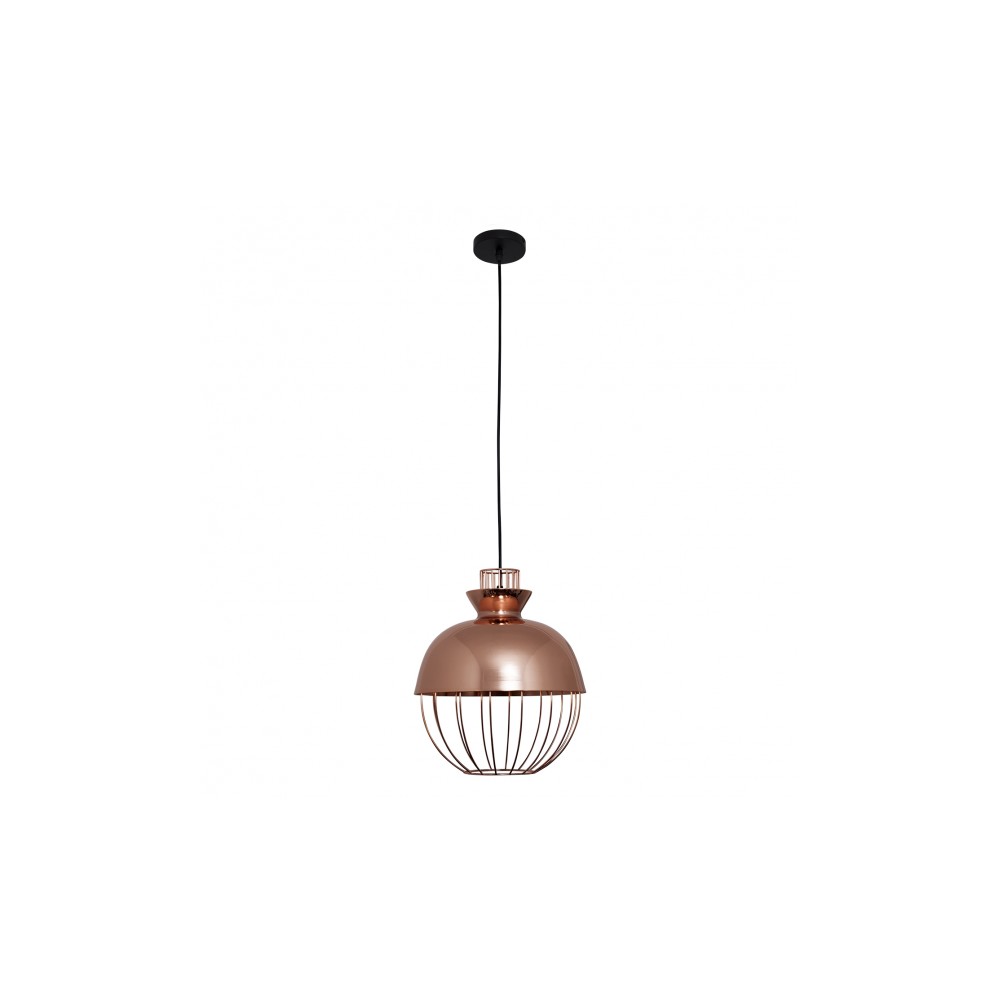 Lamapra TOYAMA série de couleur cuivre. Ce pendentif original est fabriqué en métal et présente une forme de bille qui permet à la lumière de passer par la grille. Le portail est E27 et ses dimensions 42