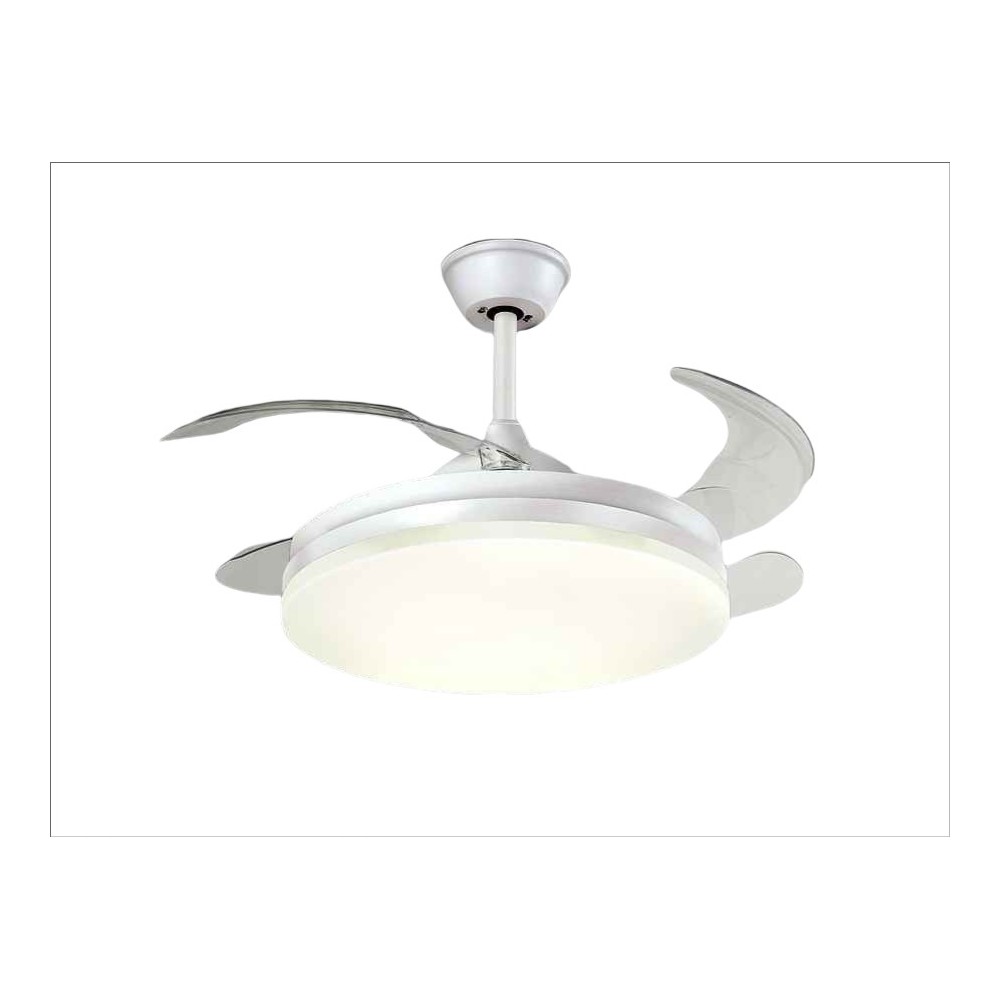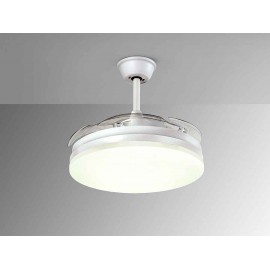 VENTO modèle ventilateur de plafond avec CCT LED lumière en métal blanc mat, diffuseur opal et poignées transparentes déroulantes, en acrylique haute résistance.