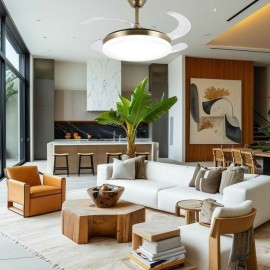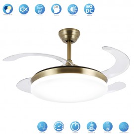 Ventilateur de plafond intérieur avec ISABELLA intégré L modèle en finition en cuir satin avec quatre lames en méthacrylate transparent très résistantes. Il est équipé de moteur DC et six vitesses.