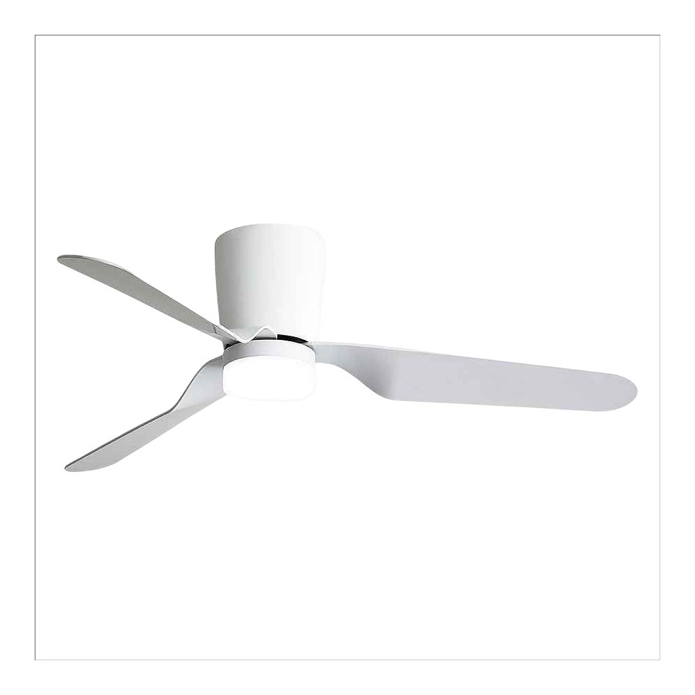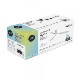 Ventilateur de plafond intégré KOCHI avec trois pics blancs. Il est équipé de moteur DC et de cinq vitesses. Mesure de 27 cm de haut et de 132 cm de diamètre.