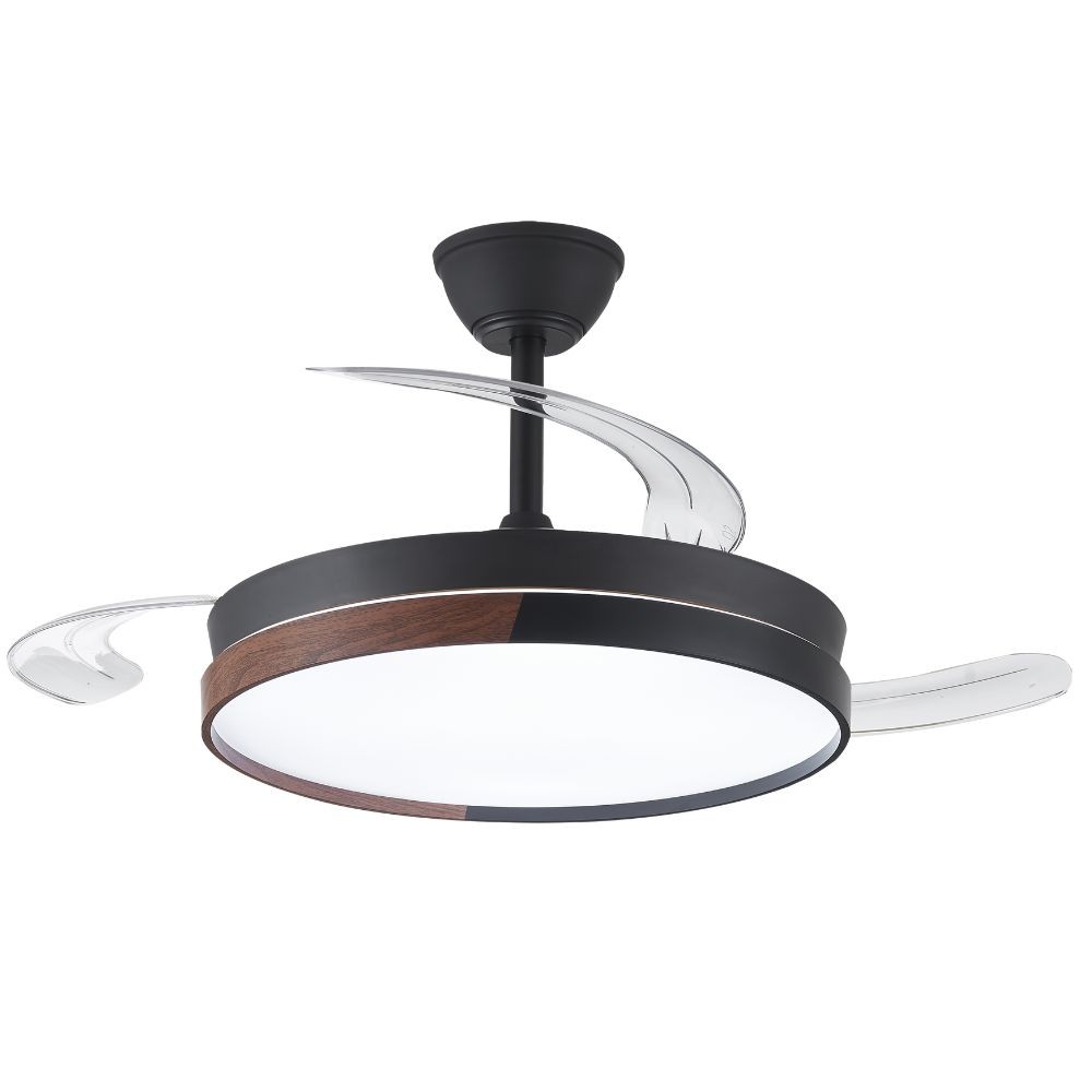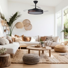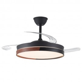 Ventilateur de plafond VISTA en métal, avec aspes en polycarbonate et diffuseur acrylique, en noir-haya, avec trois aspes pliants.