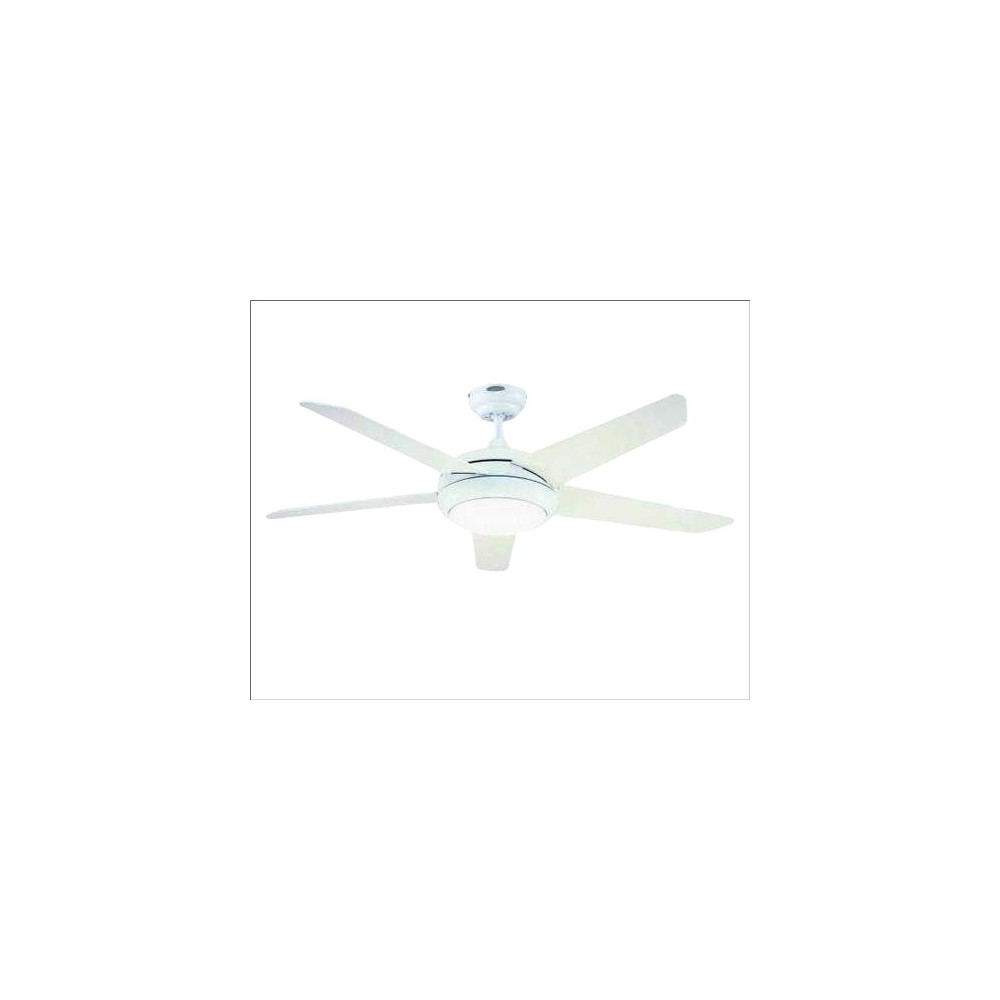 Grande promotion de la lampe de ventilateur de plafond avec lumière. Ce ventilateur est fabriqué en acier et laqué fini sur blanc, panneau de verre et 5 lames laquées blanches.