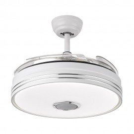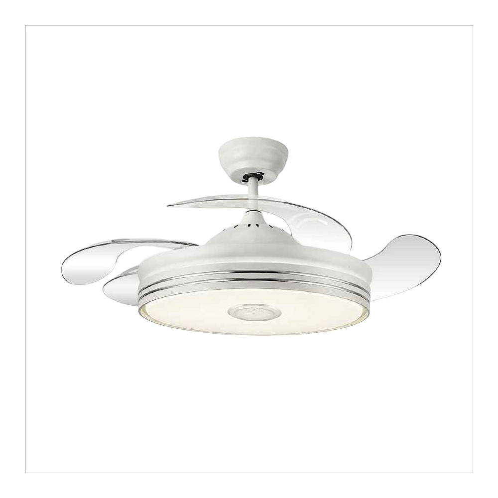 Ventilateur de plafond intégré MATANUSKA avec quatre lames de méthacrylate très résistantes et transparentes. Il est équipé de moteur DC et six vitesses. Mesures 32x55 centimètres avec lames pliées et 32x108 centimètres avec les lames déployées.