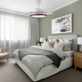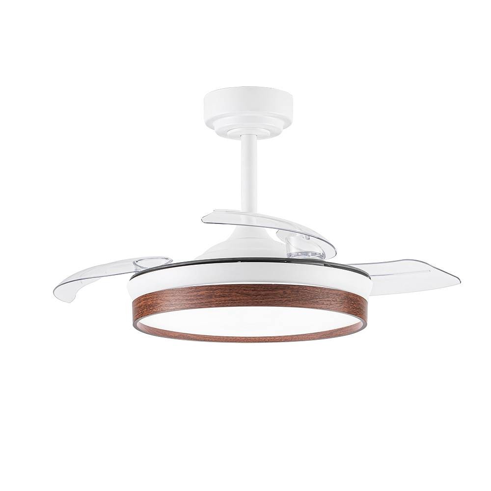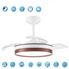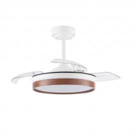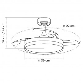 Ventilateur de la série DOÑANA S en métal, avec aspes en polycarbonate et diffuseur acrylique, en couleur blanche foncée, avec trois aspes pliants. Moteur DC, six vitesses. Technologie LED intégrée avec une puissance de 46W, 5520 lumens et 3 LIGHT SELECTED TEMPERATURES (3000-4500-6000K) lumière blanche chaude, naturelle et froide. Design très moderne et original, idéal pour placer dans des chambres, des salons et des studios inspirés de nouveaux styles de décoration tels que Industriel ou Moderne. . Air control summer or winter. Télécommande Inclus avec COLOR MEMORY incorporé et TEMPORIZER 2/4 H.