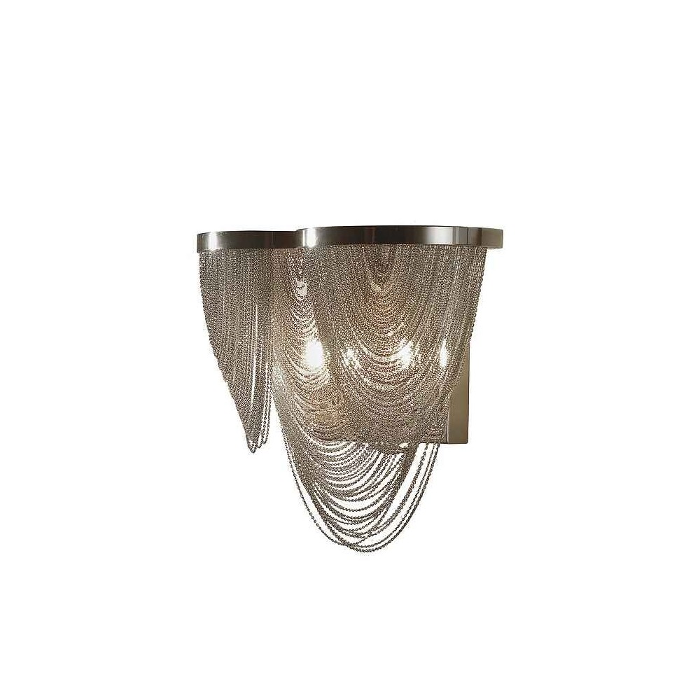 Lampada da parete serie Minerva della firma Schuller, riconosciuta a livello internazionale, composta da sottili catene di metallo con finitura in nichel, che formano il corpo della lampada, conferendogli un aspetto classico e allo stesso tempo molto moderno in quanto è interamente in metallo