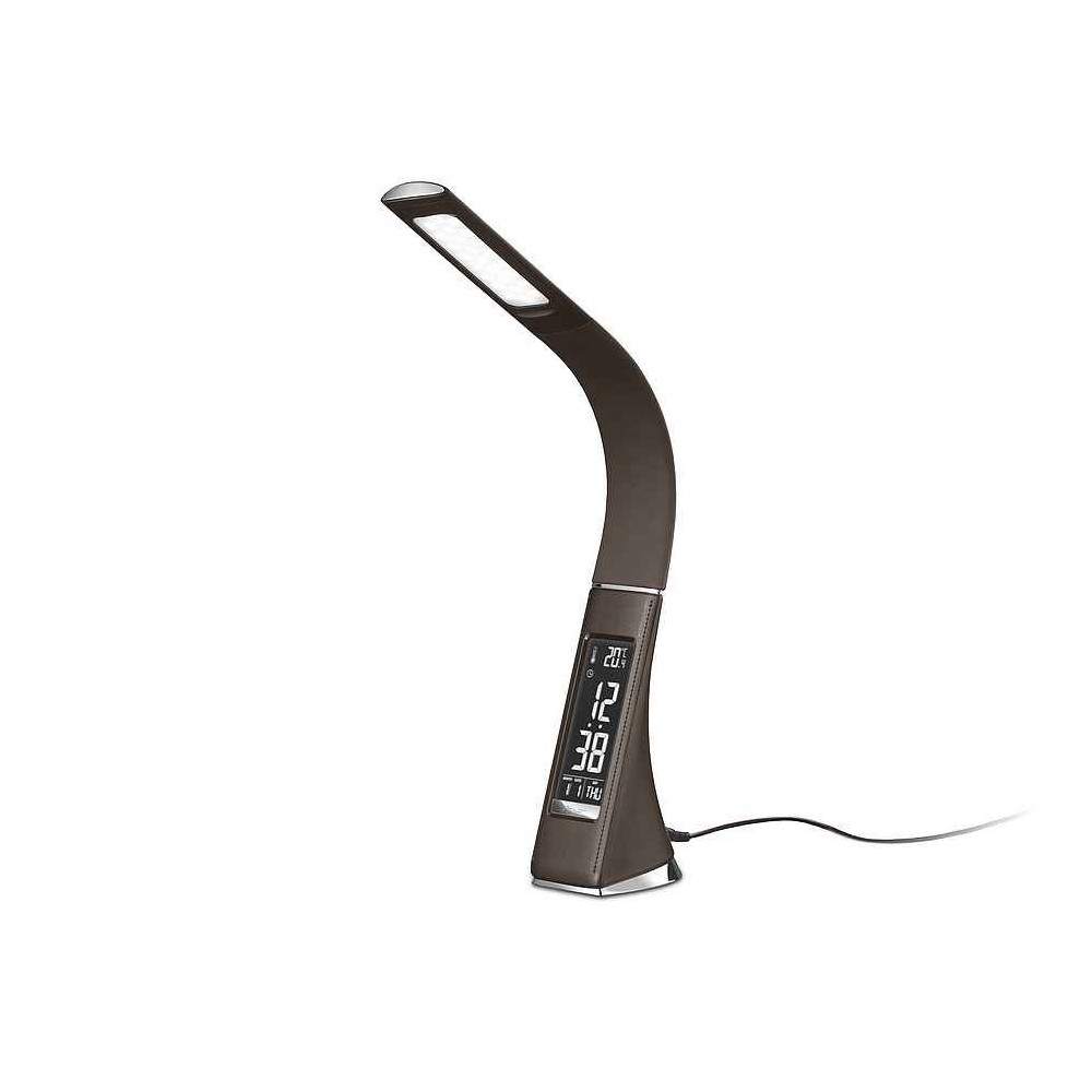 Flesso da tavolo da studio modello ALIVE LED, realizzato in ABS e gomma marrone, texture pelle con cuciture, di dimensioni 7x40 cm. con braccio flessibile e intensità regolabile. Display VA con orologio, allarme, calendario e termometro. Dimensioni: 7,0 40,0 20,0 cm Altezza installata: 28,0/ massimo 45,0 cm Peso: 0,6 Kg Classe elettrica: Class 3 Potenza massima: 5W Voltaggio: 5 V Flusso luminoso: 200 lm Temperatura di colore: 5.000 K Vita media: 35.000 h Fattore di potenza: >0.4 CRI: >80