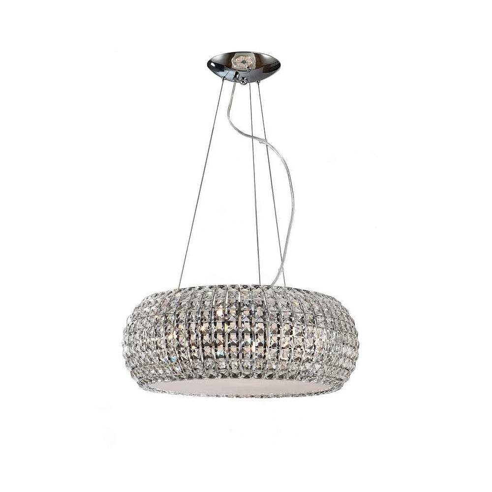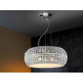 Lampara Diamond della firma Schuller, riconosciuta a livello internazionale, dispone di 9 luci ed è realizzata in metallo finito cromo. Tulipa composta da coppe quadrate di cristallo trasparente K9, regolabile in altezza con un tensore in acciaio. Include diffusore inferiore in cristallo opaco.