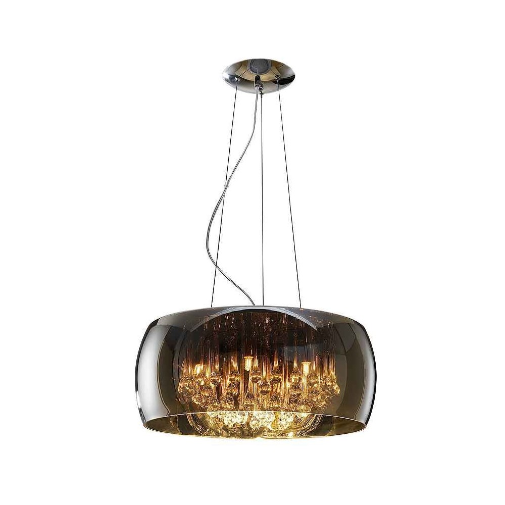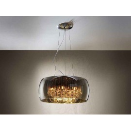 Lampara Argos della firma Schuller, riconosciuta a livello internazionale, dispone di 6 luci ed è realizzata in metallo finito cromo. Tulipa di vetro specchiato e lacrime interne di vetro tipo Murano.