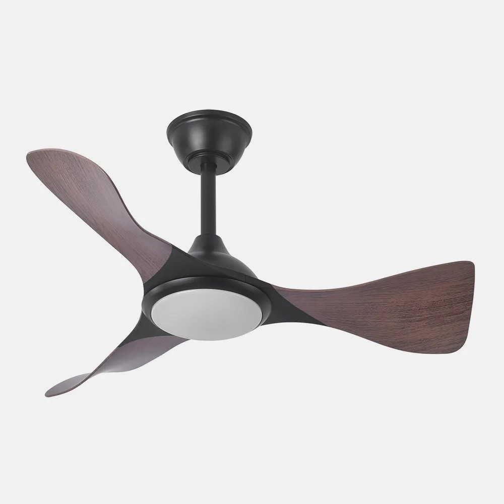 Ventilador DC de la serie CAIMAN realizado en metal, ABS y policarbonato, en color NEGRO con tres aspas de color ROBLE. Tiene seis velocidades ajustables. Motor DC, con INSTALACION DE LUZ OPCIONAL. TecnologÃa LED incorporada con una potencia de 36 vatios, con 3 TEMPERATURAS DE LUZ( 3000-4500-6500K) y 3600 lúmenes. De diseño moderno y original.Su medida es de 26/41X89X89 centÃmetros, con dos tijas de 10 y 25 centÃmetros para instalar a distintas alturas. Control de aire verano e invierno. REGULABLE EN INTENSIDAD, con mando a distancia INCLUIDO, MEMORIA DE COLOR incorporada y TEMPORIZADOR 1/4/8 H. Su voltaje va de 186 a 265 vatios, lo que resiste en un campo muy amplio a subidas y bajadas de tensión sin sufrir daño alguno. Modelo disponible en negro, blanco, blanco/haya y en negro/roble.Â